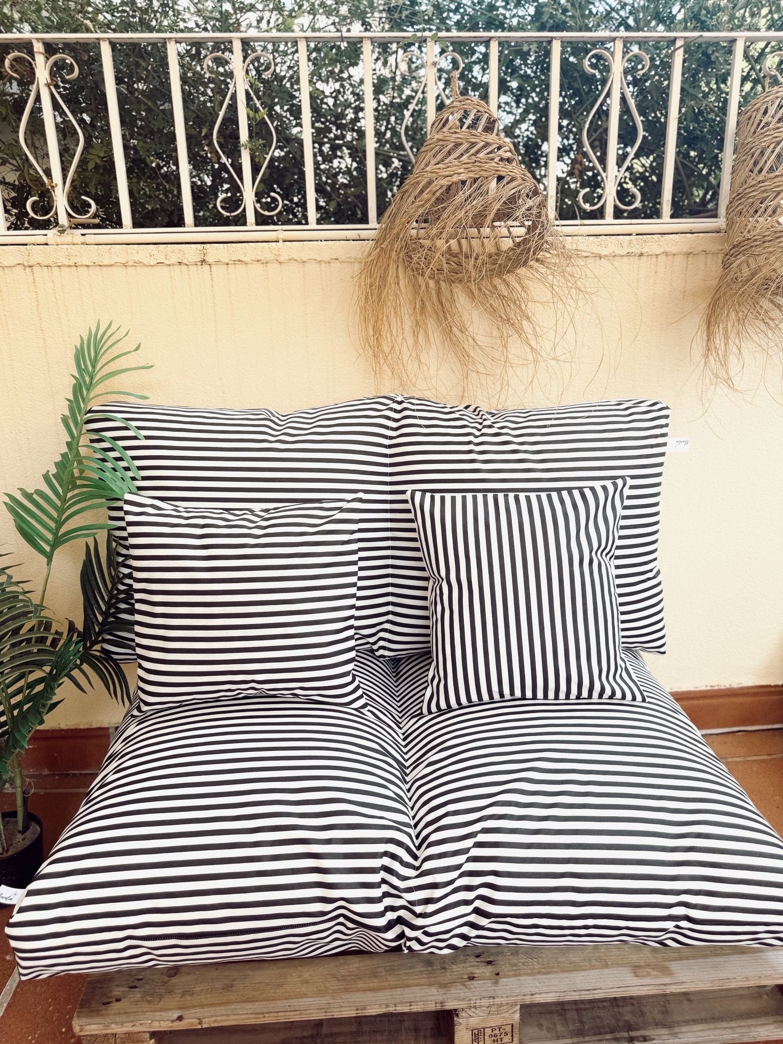 Los colchones para palets más vendidos ahora disponibles en tejido impermeable resinado y desenfundables con diseño rayas negras, ideales para terraza, jardín o piscina.La excelente resistencia del tejido, soporta el uso en exterior, bajo techo sin problemas.